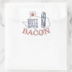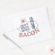 Texas bacon-lover sticker with an old west look. Red and blue graphic of a lone star, an outline of Texas, and a bacon strip. Funny bacon quote from Houston to El Paso.