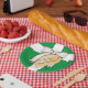 This playful holiday design features a big white ribbon and bow, that makes the plate look like a gift. The tag reads'Don Not Open Until Christmas! Text on the tag, and the background colour can be customised.