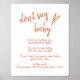 Simple, modern and elegant Don't say baby Sign. Easily customise the words to make it uniquely yours. This design can also be use for other occasion just change the wordings to match your event. Visit Modern And Minimalist collection for matching party goods. Napkins, thank you cards, welcome signs and more.