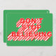Don't Stop Believing - a fun holiday card for the kid in all of us celebrating the Christmas season. Typography design with red and white striped candy cane long shadow text on a green background. The back of this Christmas card includes coordinating red and white text for you to personalise. "Merry Christmas" your family name and individual names. Be sure to update the year.