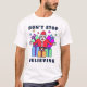 Santa Claus surrounded by colourful wrapped gifts with the phrase "Don't Stop Believing" above. The image is vibrant and cheerful, perfect for holiday-themed designs and messages