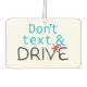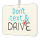 A friendly reminder to please not text while driving on a car air freshener. The text reads "Don't text & DRIVE", and the word DRIVE looks like skid marks, with a blood splat. The word Drive is in the iQ font, which was created by tracking the path of a moving car. Want this or a similar design on another item? Browse my Dont Text and Drive shop.