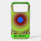 The image prominently features the uplifting phrases "DON'T WORRY" at the top and "BE HAPPY" at the bottom. At the centre lies a vibrant, circular kaleidoscopic pattern, framed by a bold green square adorned with small blue circles at each corner. The entire design is set against a bright green, textured background, creating a balanced and centred composition that draws the eye.