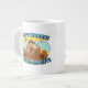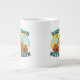 This oversize geology mug depicts a cartoon geologist in a retro, 1930s-1940s cartoon style. Happy Mr. Sun is shining down on the desert with a happy little cloud and some jolly rocks looking on, while a happy-go-lucky geologist prances out into the field with his rock hammer and hand lens!