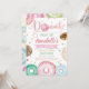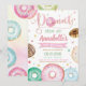 The design features donuts with colorful with sprinkles and confetti in pastel colors. It's a perfect birthday invitation for a girl having donut or sweet themed party.