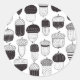Autumn pattern with various doodled acorns in black and white, vector illustration.