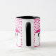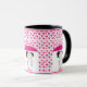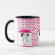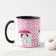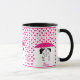 Cute mug featuring doodle boy and girl holding umbrella, under pink heart rain.