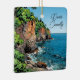 A Christmas ornament with an comic style illustration of Door County, Wisconsin. The pretty dune ledges and rustling blue water or Lake Michigan.