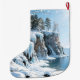 Pretty Christmas stocking with an illustration of Door County in the winter. The pretty dune ledges covered in icicles and frozen blue ice, blue water of Lake Michigan hitting against the bluffs, Sun shining lighting up the sparkling snow and ice. Christmas lights in the trees.