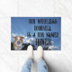 This doormat displays the message, "Our wireless doorbell is a dog named Rover". The name of the dog is customisable with your own dog's name. A cutout photo of a dog is featured in the lower left corner which you can replace with your own dog's photo. The background is a sunset with rays from behind fluffy clouds. If you need help customising, please contact me at jen@jenaleefamilystorykeeper.com