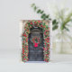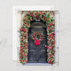 Celebrate the season with the timeless elegance of English architecture. This greeting card features a beautifully captured black door in London, England, framed by a lavish archway of evergreen garland, red floral accents, and shimmering gold baubles. A matching wreath and bright red bow complete the festive look, inviting the viewer into a warm, holiday atmosphere.