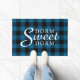 Unique, elegant and decorative modern farmhouse style doormat with cute Dorm Sweet Dorm quote text, on a classy blue and black coloured Buffalo Lumberjack tartan checks pattern design.