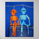 Two colourful calacas or esqueletos sitting on a Mexican wooden box. Celebrate Day of the Dead with this vivid pair of clay skeletons on your wall!