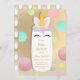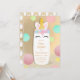 An invitation with a cartoon illustration of a baby bottle with unicorn ears and dark eyelashes. The front of the invitation has a polka dot background. (The gold-tone background is non-foil)