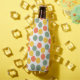 This bottle cooler has a geometric design of dots in coral, gold, and sage green.