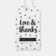 Stylish Modern Wedding Favour Tag featuring the words "Love and Thanks" against a dots pattern.