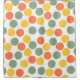 This shower curtain has a geometric design of dots in coral, gold, and sage green.