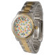 This men's watch has a geometric design of dots in coral, gold, and sage green.