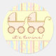Announce the great news with this fun sticker design. Two pink carriages with stripes of blue, pink and yellow make the fun announcement on your baby shower or announcement envelopes.