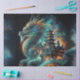 A majestic Chinese dragon emerges from the mist, its powerful form seamlessly blending into the silhouette of an ancient Chinese temple.