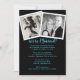 Black and aqua blue marriage announcement with two photo templates at the top. "We're married!" text in bold script beneath square pictures of the couple. Your photos can be or any orientation and size with the subject in the centre. They will pop into place inside white frames. Solid black background with bright blue printed font makes this invitation unique and modern. Include reception information, or any wording, which is easy to personalise for your event in paragraph form. Rounded corners are one of the options.