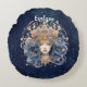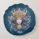 Get this artsy, unique, modern double-sided round pillow for yourself, loved ones or for your business, featuring a watercolor astrological sign, the Vigro in a beautiful illustration and custom text on both sides, over blue background, designed by PiccoGrande.