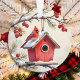 A beautiful double=sided Christmas ornament. Each side has a pretty illustration of cardinals. One on a bird house and the other on a pretty snow covered pine branch with red berries.