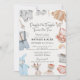 A unique design for girl & boy twins for a VIRTUAL shower, featuring an illustration set of baby clothes, shoes, toys and, rainbows in modern subtle colours including blue, pink, light red, grey, brown. Personalise your template front and back.
