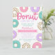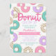 Doughnut themed kid's birthday party invitation in sweet pastel colours with gold glitter accents