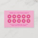 Doughnut pastry bakery loyalty punch card template. Custom company reward card design for doughnut store and more. Customisable hot pink colours. Space for 10 stamps / punch holes. Offer return clients and customers a discount or free order. Two sided print with desserts.