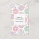 Business card with a deliciously fun pattern. Illustration of pastel pink and green doughnuts with sprinkles and icing.