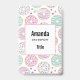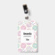 Name tag with a deliciously fun pattern. Illustration of pastel pink and green doughnuts with sprinkles and icing.