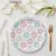 Paper plates with a deliciously fun pattern. Illustration of pastel pink and green doughnuts with sprinkles and icing.