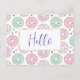 A postcard with a deliciously fun pattern. Illustration of pastel pink and green doughnuts with sprinkles and icing.