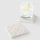 A stone coaster with a deliciously fun pattern. Illustration of pastel pink and green doughnuts with sprinkles and icing.