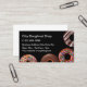 Doughnut shop business card template designed with a variety of donuts in the background with a simple layout that lets you display your contact number, hours of operation, location, and website.