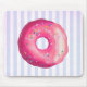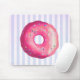 Mousepad with a yummy illustration of a pink frosted doughnut with colourful sprinkles. The background is a faded pastel pink and purple striped pattern.