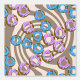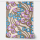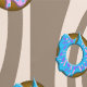 Pink and blue icing doughnuts with sprinkles on a coffee swirl background.