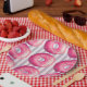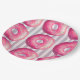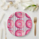 A set of paper plates  with a yummy illustration of a pink frosted doughnut with colourful sprinkles. Set on a shabby vintage pastel purple and pink striped background.
