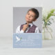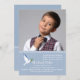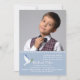 A blue panel with a dotted top border hods a white dove with a sprig of leaves in his beak. An invitation that's perfect for any religious celebration. Just add your favourite photo.