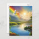 An image of a dove flying over a serene landscape with a rainbow in the sky.