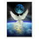 A white Dove of Peace spreads its wings above the blue horizon of Planet Earth with a neon blue moon in the background. The sunrise shines at the rim of the world and light rays bathe the Earth. This is a beautiful design to promote world peace and unity for the New Year, Earth Day, or for any occasion. For Christians, the Dove is a symbol of the Holy Spirit, Spirit of Peace, or Spirit of God.