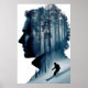 Experience a striking blend of mountain majesty and thrilling action in this unique double exposure portrait. A man, wearing a woollen hat, has the upper part of his head and profile artfully merged with large snow-covered mountains and fir trees, while his cheeks and the front of his face remain clearly visible. In a captivating detail, just below his jawline, a dynamic figure of a man is captured skiing down a steep, snowy slope. This artwork uniquely combines the serene grandeur of alpine landscapes with the exhilarating energy of winter sports, creating a compelling narrative of adventure and connection to the peaks. Perfect for lovers of mountain scenery, ski enthusiasts, or anyone who appreciates innovative, layered art.