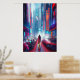 A colourful art of a person walking down the street of a city, vehicle and tall building on both side of the street. This is a AI generated art.