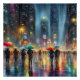 Adding a vibrant touch of humanity to the scene, pedestrians navigate the streets under a canopy of colourful umbrellas, their forms creating interesting shapes and splashes of colour against the monochromatic backdrop. The soft, diffused glow of street lamps casts a warm ambiance, cutting through the rain and mist. In the foreground, raindrops create hypnotic concentric ripples in puddles, adding a dynamic element to the composition.
