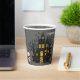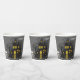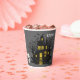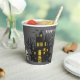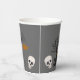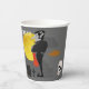 These fun Halloween party paper cups feature a dark haunted house with glowing yellow windows set amidst an eerie graveyard. A bright yellow full moon fills the sky, bats fly around, and a Dracula style vampire stands watch with his arms crossed. Two gleaming white skulls are placed at each end of the scene, and your custom text is in spooky white text at the top.