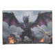 A large, dark purple dragon with massive wings faces a warrior in golden armor, who is holding a sword. The dragon is detailed with spikes and a menacing expression. The warrior is seen from the back, ready to fight. The ground is rocky and fiery, suggesting a volcanic or hellish landscape. The sky is overcast, adding to the dramatic atmosphere of the scene.