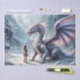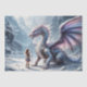 A striking design featuring a dragon facing a warrior woman in a snowy, icy landscape. Soft, light colours with glowing violet hues create a magical and serene atmosphere.