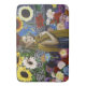 An auburn haired elf taking a walk through a colourful flower garden with four small dragons with a grey cement celtic knot work wall in behind