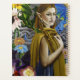 An auburn haired elf taking a walk through a colourful flower garden with four small dragons with a grey cement t celtic knot work wall in behind